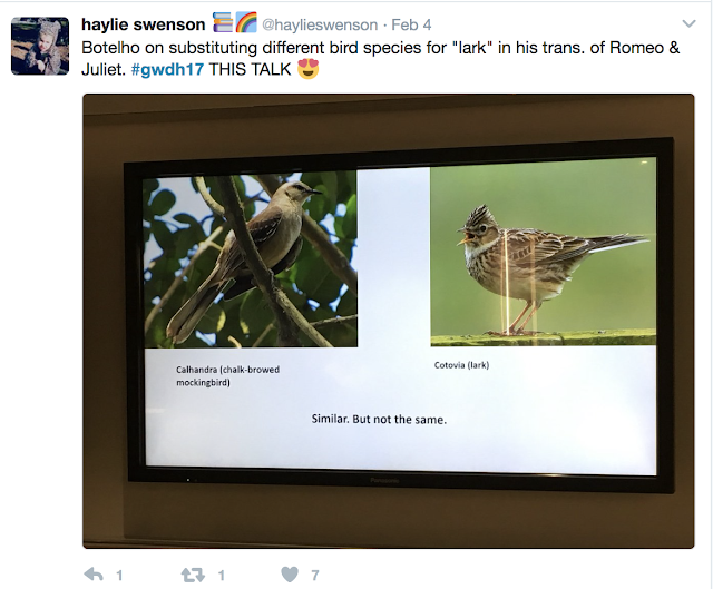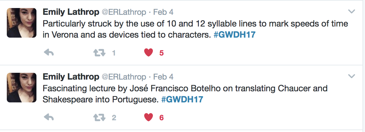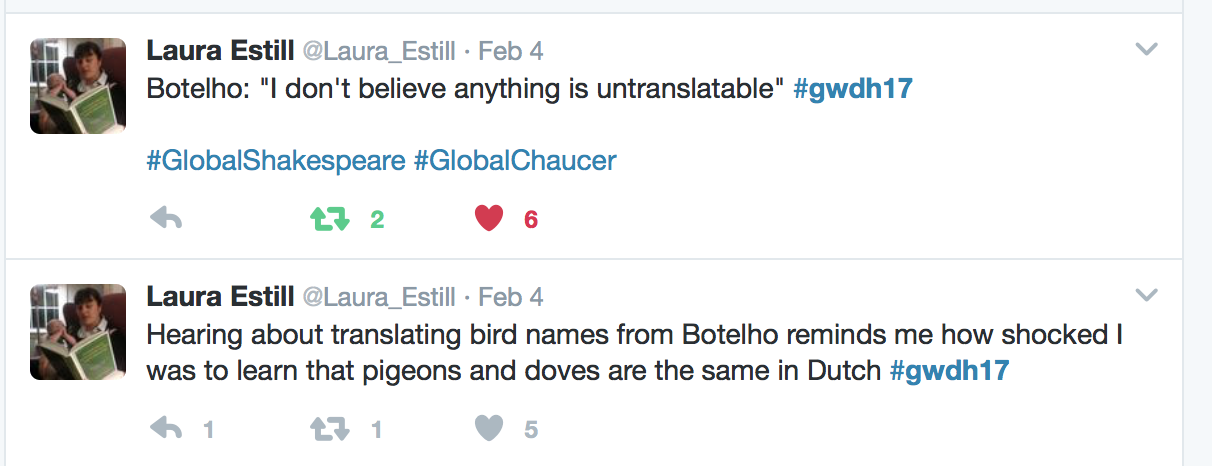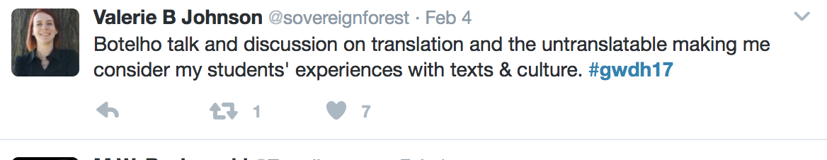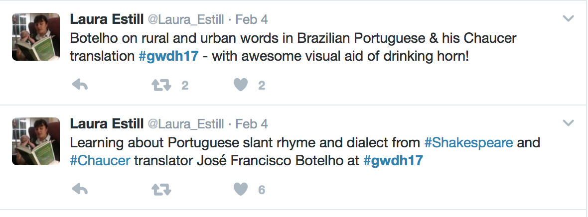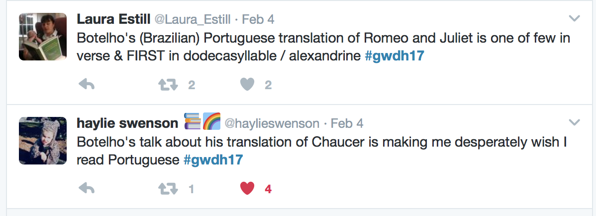 As Botelho presented, audience members provided keen insight and archived notable moments in real time on twitter, using the official symposium hashtag #GWDH17
