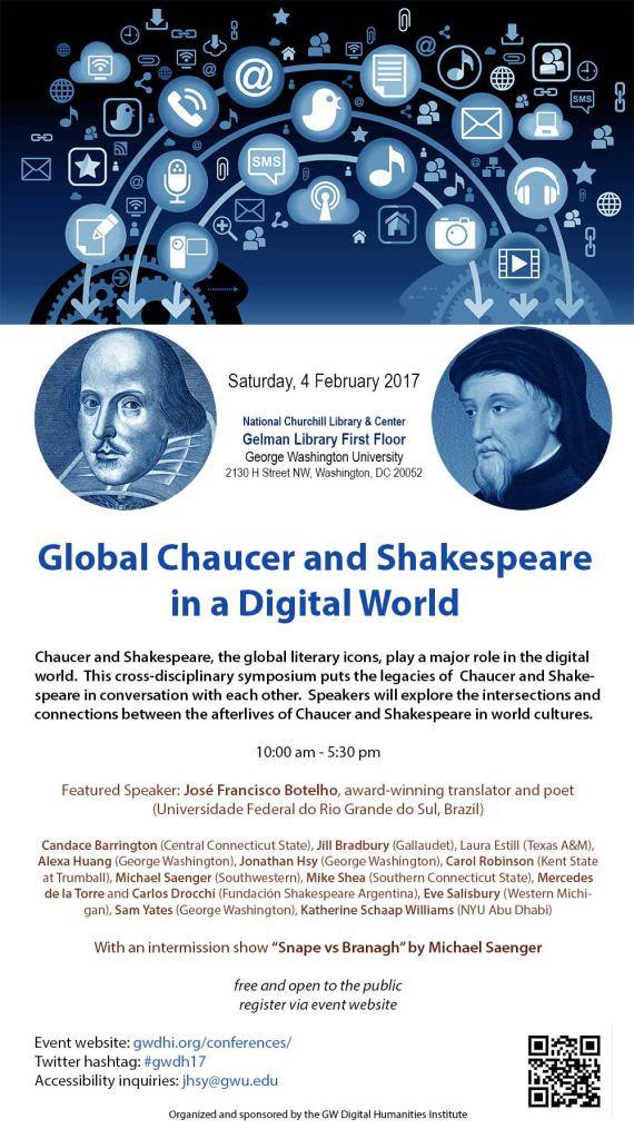 “Chaucer and Shakespeare, the global literary icons, play a major role in the digital world. This cross-disciplinary symposium puts the legacies of Chaucer and Shakespeare in conversation with each other. Speakers will explore the intersections and connections between the afterlives of Chaucer and Shakespeare in world cultures.”