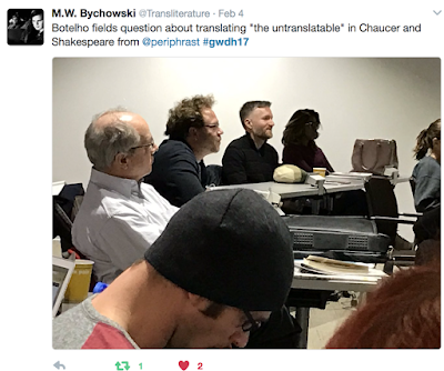 “José Francisco Botelho‘s brilliant presentation on how Chaucer’s “horsely horse” inspired him to translate the Canterbury Tales into Brazilian Portuguese (chair: Candace Barrington). His goal is not to “subdue Chaucer’s medieval strangeness but to create a hybrid medievalism through Romeo and Juliet as well as the Tales.”