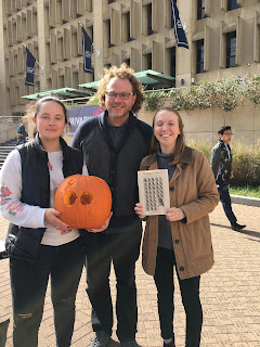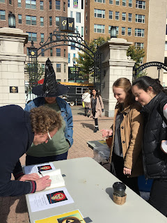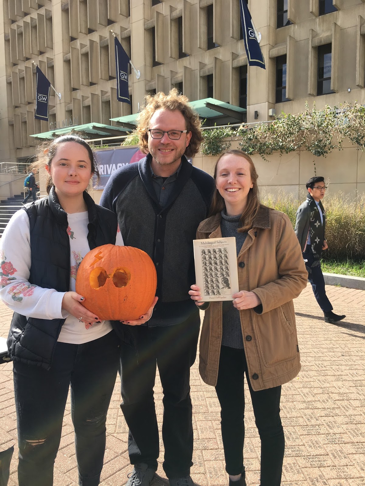 The English Department’s annual Jack-O-Lit gathering had a great turn out this year! Many students joined the English faculty in sharing cookies and cider, as well as carving pumpkins into some very creative designs. Maggie Benda and Oona Intemann won Professor Daniel DeWispelare’s new book, Multilingual Subjects, On Standard English, Its Speakers, and Others in the Long Eighteenth Century, in the Pumpkin Carving Contest with their Harry Potter themed carving. Also present were members of Wooden Teeth, GW’s student-run literary journal, who passed out issues of their first zine. If you see one floating around campus make sure you pick one up to enjoy the beautiful art and poetry as well as some spooky song suggestions for your last minute Halloween Party. This year’s Jack-O-Lit will be hard to top, but we look forward to seeing you all this time next year for some more festive fellowship!