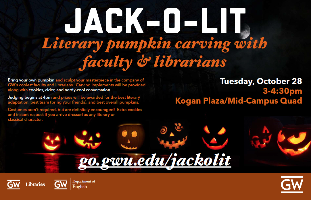 Bring your own pumpkin and sculpt your masterpiece in the company of GW’s coolest faculty and librarians.  Carving implements will be provided along with cookies, cider, and nerdy-cool conversation.